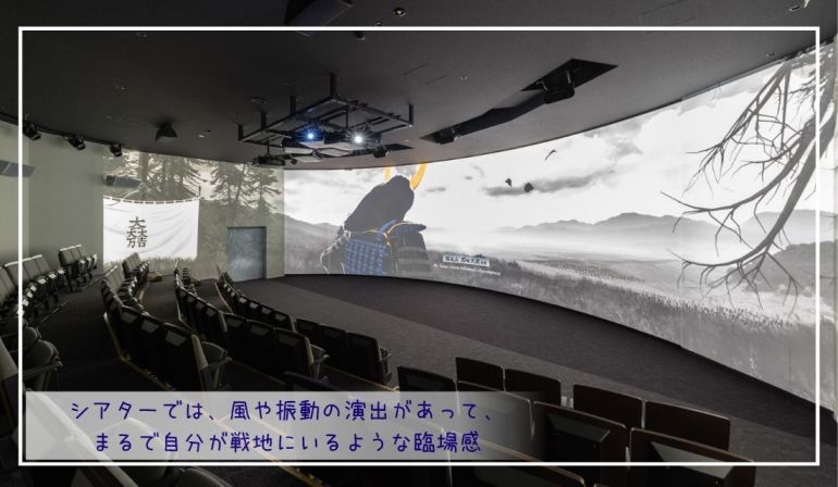 そして、次はシアターへ移動。大スクリーンで、関ケ原の合戦の両軍の激突の様子が描かれるのですが、なんと、風や振動の演出があって、まるで自分が戦地にいるような臨場感!!