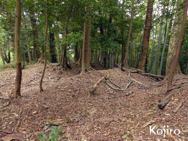 案内板から城址方向に歩いてみると段々の平坦地が現れます。最高所が主郭で南下に二郭と見られる郭。二郭の左手に土塁か土橋のようなものが主郭に続いていています。主郭の周囲は土塁で囲まれ虎口は北側についています。主郭西側にも郭があり、尾根上にさらに西に降りていくと堀切が尾根を遮断しています。ふたたび二の郭に戻って南に向い、下側に降りたところに石垣が残っています。