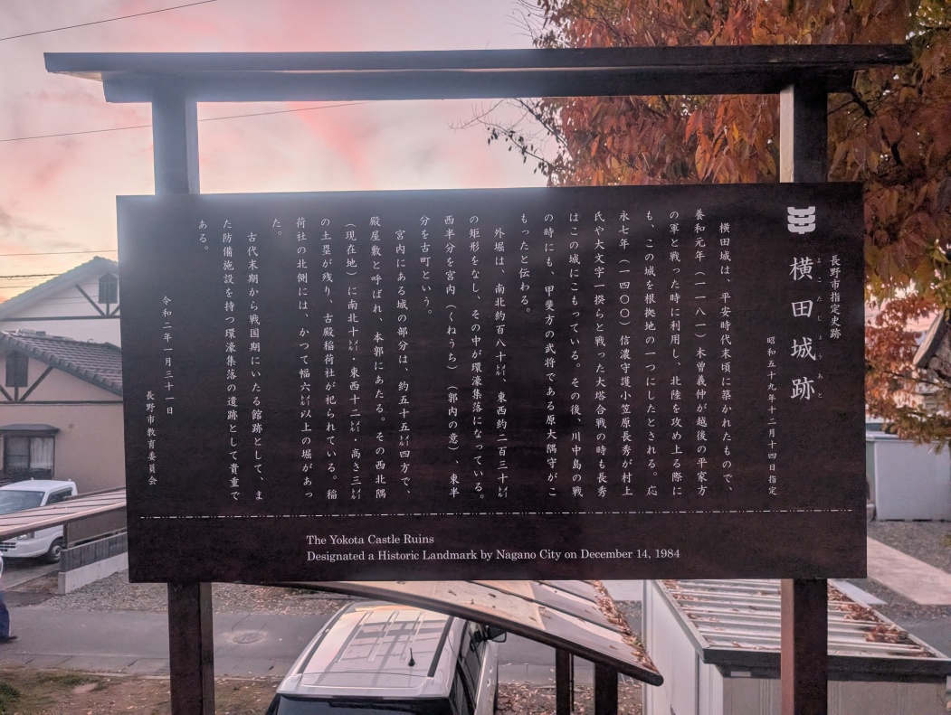 案内板によると横田城は平安時代末ごろに築かれたとされ養和元年(1181)木曽義仲が越後の平氏の軍勢と戦った時に使用されたそうです。応永7年(1400)の大塔合戦の際には信濃守護小笠原長秀がこの城に籠って村上氏や大文字一揆らと戦っており、