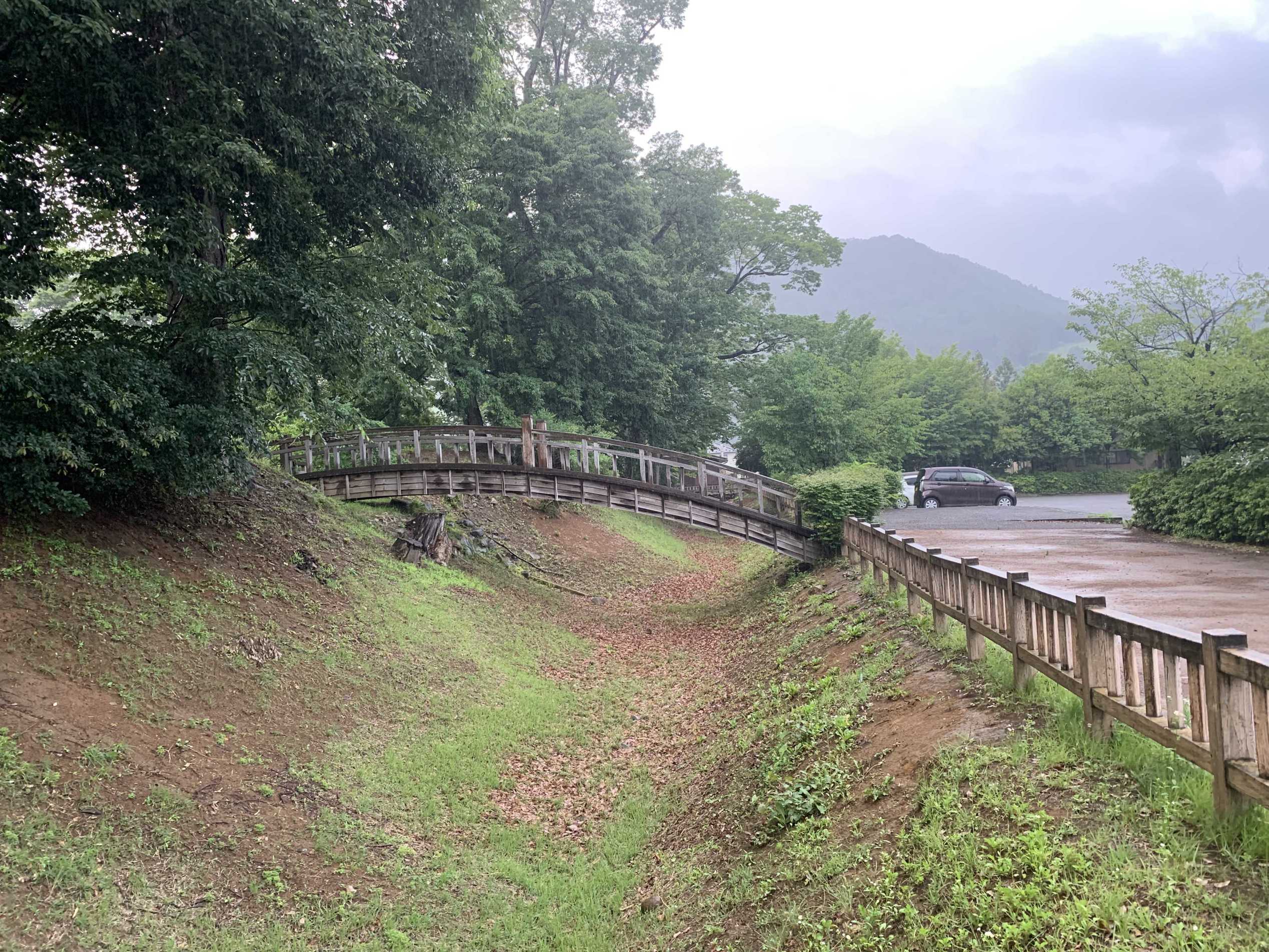 内部から東方向を眺めて、山々は鴨ヶ嶽城方向かな?、土塁周囲には木々が高く茂っている、発掘整備された庭園跡、井戸跡、建物跡は地表展示されている、東虎口と左右の土塁と堀を眺めて、南西角の土塁と堀を観察し西虎口に架かる橋を見て終了。