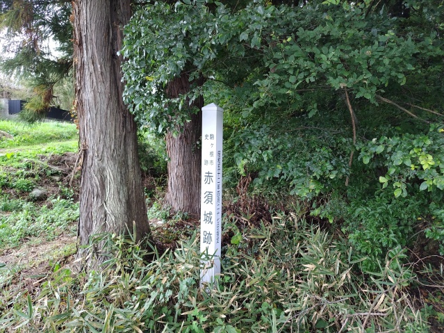 赤須城は天竜川の支流の宮沢川の北側の丘陵の先端部に築かれていて、城址の中央を道路が通過し、道路の両脇や周辺に遺構が残っています。南北朝時代に北朝方だった船山城の片桐(切)氏の分流片桐孫三郎為幸がこの地に城を築き赤須氏を称したのが始まりとされています。主郭の西に二の郭が続きますが、両郭とも見事に道路で分断されています。二の郭の西側には土塁がよく残りますが、郭自体は藪に覆われています。東端には外城があって形がそのまま残りますが、土塁などはなく藪におおわれています。各郭の間は堀切で区切られ、二の丸の西側一帯にも添郭や茶の城、室屋などの郭が配されていたようです。