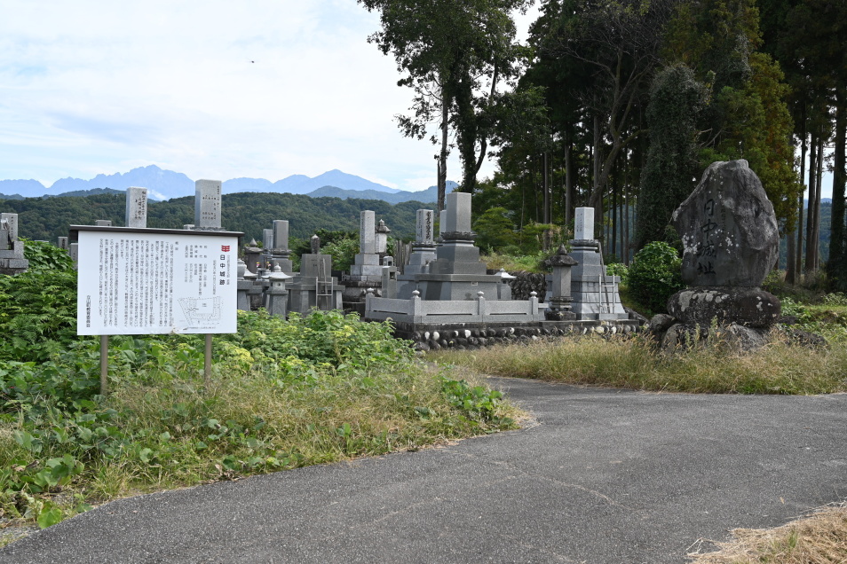 日中城は白岩川の左岸の段級の上に築かれています。単郭のシンプルな平城(平山城?)ですが周囲を土塁と空堀で囲まれていて、城址をそのまま墓地に転用しているので破壊されることも無く、状態を良く残しています。良い墓地であり、良い城址です。