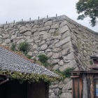 境内を出て、今度は外周を一周します。雲浜古城図によれば、境内南東隅の石垣は大手枡形、北東隅は搦手枡形の石垣のようです。搦手を守るのは翳櫓、北西隅には乾櫓、西辺には西櫓の石垣が続き、小天守から天守台へと繋がっています。本丸を囲む内堀は埋め立てられ、間近まで住宅が建ち並んでいますが、石垣直下に敷かれた防草シートの上を歩いて一周することができます。ただ、住宅のすぐ裏手なので、通行にも写真撮影にも非常に気を遣いますが…。周囲の石垣の高さもなかなかのものながら、直下から見上げる天守台の高さは一際で、ファインダーに収まりきらないほどでした。