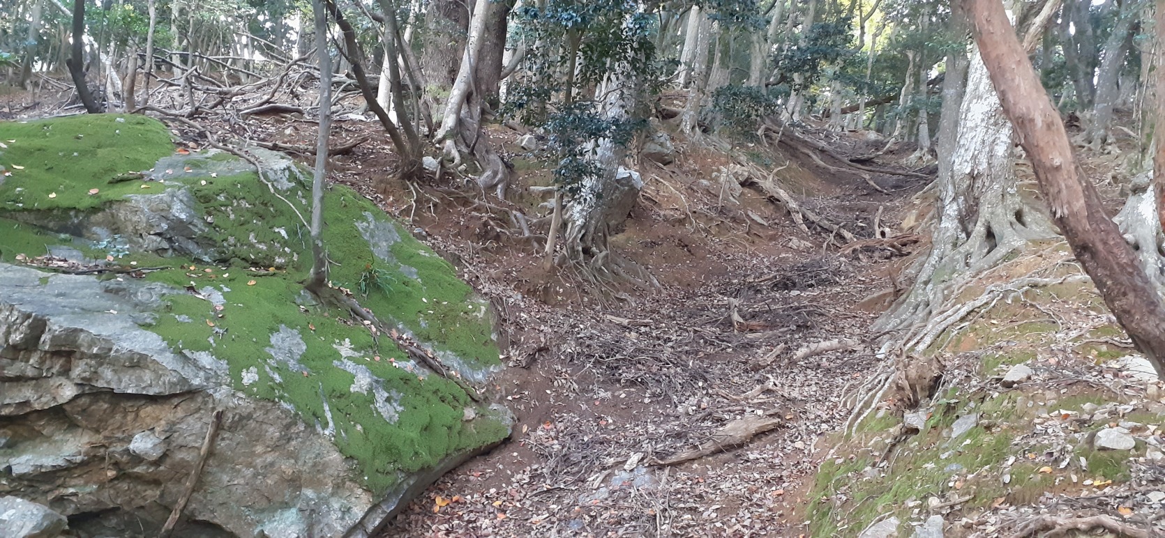 主郭から山上御殿に向かうべく南端から下りて行くと、南斜面に大きな竪堀が落ちていました。山上御殿の南麓にも数条の大きな竪堀が見られ、南西尾根に続く尾根道は土橋を設けた堀切(竪堀)で遮断しています。