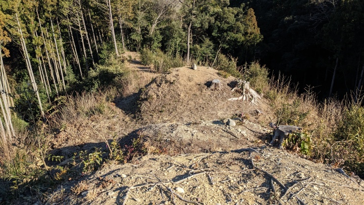 三の曲輪の北側の大木が全面伐採されて、初登城時鬱蒼とした森林で薄暗く現在の虎口にたどり着くまで不安に成ったものですが出曲輪の茶畑を過ぎた辺りから視界が一挙に開けて三の曲輪北壁城塁がよく視認理解できる様に成り、二段の高土塁が聳えて、中段の土塁上には横堀が伸びて西に落ち込み竪堀と成って居る、三の曲輪東の尾根には二重堀切が構えている。素晴らしい景観です。
