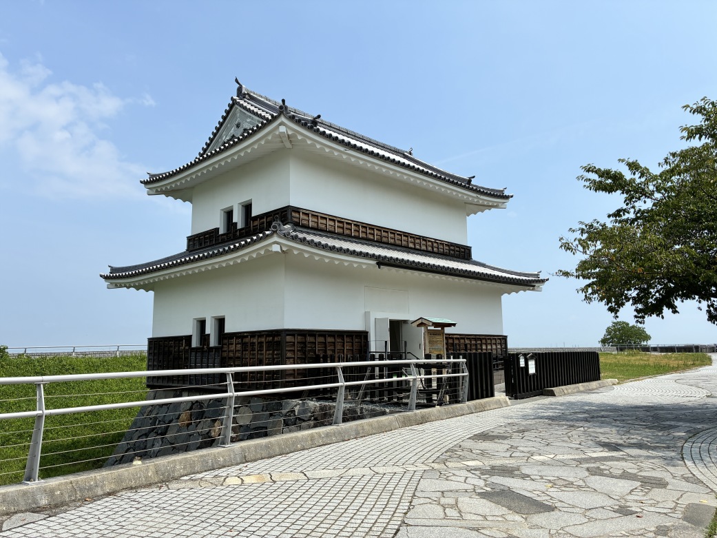 この地のもうひとつのランドマーク、蟠龍櫓。かつて建っていた場所に水門の管理棟として外観が再現されたそうですが、白壁と板張りが真夏の海と空に映えてとてもすてきでした。2階展示室の城絵図や浮世絵もよかったです。