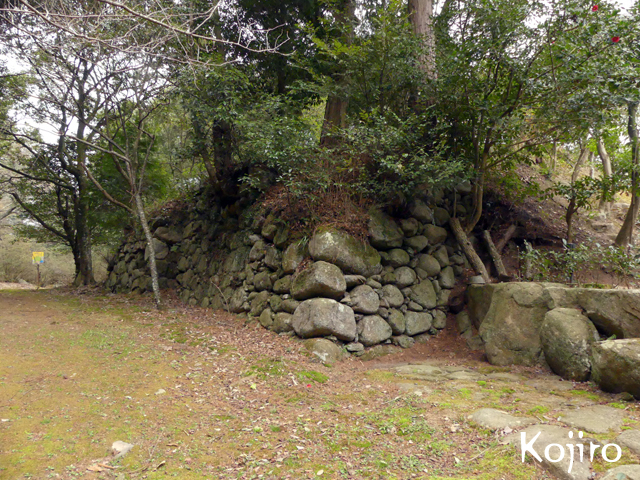 添付写真現地縄張り図①の主郭虎口の石垣は見事です。甲賀蒲生氏拠点日野城跡にも同じような石組が見られますがこちらの方が断然すごいです。主郭部分は甲賀・伊賀地方特有の方形高土塁で囲み北西部分を深い空堀で囲んでいます。主郭奥にある土塁上に上がる箇所は切り込んで石垣で固めています。さらに土塁上に礎石が残されていますので建築物があったと思われます。②④のカフェ店舗の石垣は遺構かわからないのですが当時のものの流用なら凄い石垣です。②の副郭部分にも少し低くなっていますが土塁囲みになっています。⑬の曲輪は田んぼになっていますが高土塁は圧巻で見応えあります。