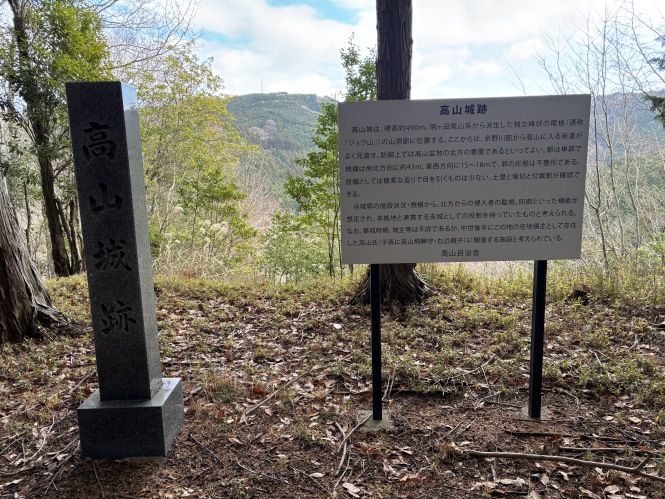 <感想>日帰り府またぎと蜜にならない城攻め1城目。2/6に行った芥川山城、高槻城に引き続いて高山友照・右近父子ゆかりの訪城となった。高山城は高山の庄の西方にあり、添付写真の道脇から伸びるスロープを登って進んで行くと5分程で山頂にたどり着く。山頂の主郭だったかと思われる場所は椎茸栽培地となっています。主郭曲輪以外はこれといった遺構は見られず、少し下った隣の山との間が削平地っぽくも見えなくなくて、そこから奥へ伸び落ちる堀跡のようなものも見付けたが定かではない。この辺り一帯が国人領主高山氏の居館だったのかもしれないなと思った。この次に行った城びと未登録高山向山城の方が城跡遺構があったので、この次に別途投稿するそちらもご覧下さい。
