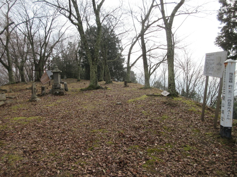 但馬富士と呼ばれる標高約201mの三開山にある城址です。主郭を中心に三方に延びる尾根に曲輪を連郭式に配置しています。曲輪周囲には多くの竪堀があり東側には二条の堀切がありました。ただ浅くなって見づらくなっているものもあります。縄張り図で畝状空堀群が描かれています。その場所を見ると雰囲気は残していますが、落ち葉の堆積もありよくわかりません。北側を少し下りた所には瑞宝寺趾、千畳敷といわれる居館跡、水の手などがあります。千畳敷周囲には石積みがあるとの情報があり、それらしき所を撮影しました。