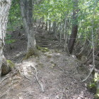 主郭の北側に降りて行くと腰郭が有り、北側に畝状の竪堀が複数配されています。さらに尾根を北に下って行くと広めの郭が有り周囲には堀切や竪堀が多数ありました。後は来た道を戻って行きましたが山肌を歩いていると急な斜面に大きな竪堀が彫られています。