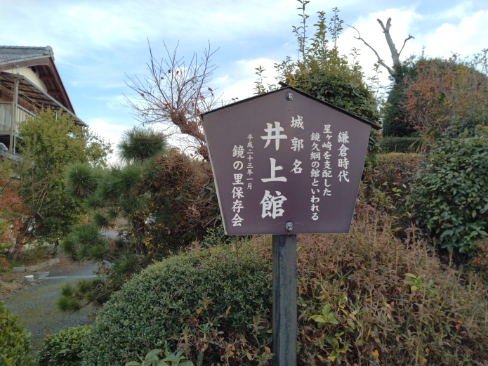 星ヶ崎城(城びと登録)の城主の鏡氏が山城の星ヶ崎城の麓(少し離れてますが)に営んだ平城・館です。星ヶ崎城と同じ山塊に小堤城(城びと登録)があり、その西麓に土塁、堀に囲まれた桜生城(城びと登録)があります。井上館は桜生城よりも少し小さく、また、単郭ですが、四面に土塁がよく残っています。桜生城と同様に現在お住まいの方がおられます。昔ながらの道が狭い村落中にあり、車で村落に進入するのは止めた方がよいです。村落の外に鏡集落センターがあるので、ここに駐車させてもらって徒歩で行くのがよろしいかと。