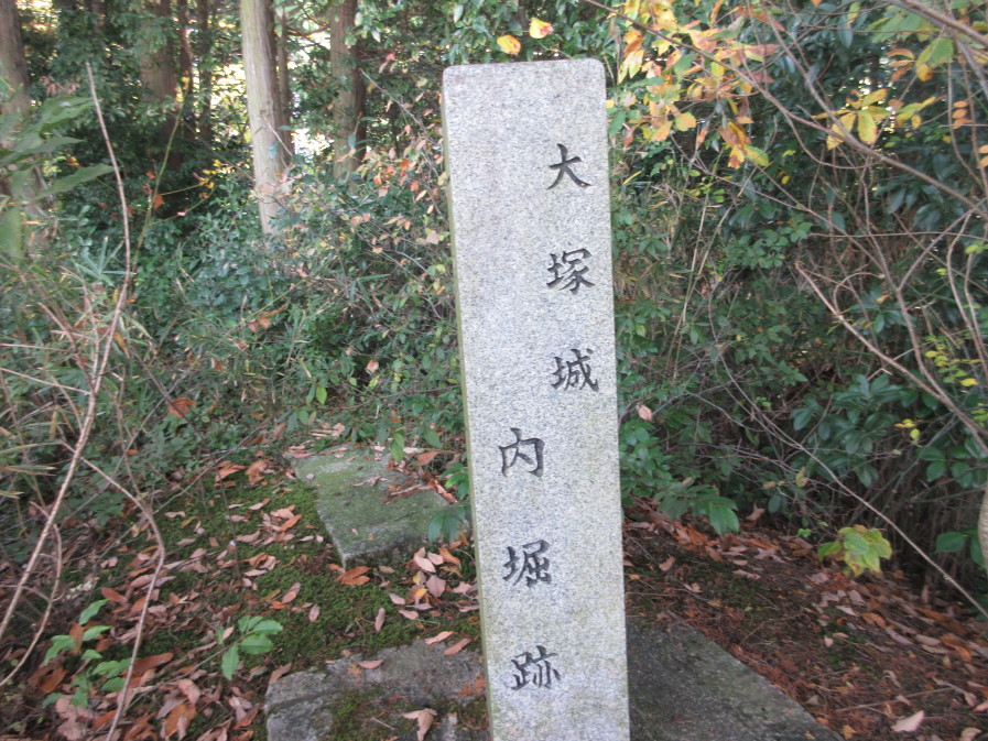 六角氏の家臣であった大塚氏の居館跡と伝わっています。どこまでが城域かはわかりませんが、土塁と水堀が一部残っています。内堀跡の石柱を見つけるのに苦労しましたが、次の電車まで時間があったので、行ったり来たりして何とか見つけることができました。藪で見えにくくなっています。