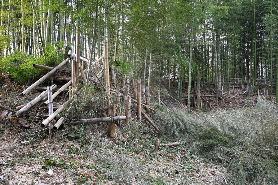 2月15日は今まで一度も献血をしたことのない日ですので、この日の献血予定は外すことができません。日曜日しか献血することのできない滋賀県赤十字血液センターの予約が取れたのはラッキーでした。献血前の攻城は、2025年に降雨のため見送った甲賀の国史跡物件としました。ホテルの朝食をいただいてからまず向かったのは、竹中城。住宅地と畑の境にある単なる竹藪かと思いきや、かなり立派な土塁と空堀で囲まれた方形居館でした。「甲賀郡中惣遺跡群」のひとつとして国の史跡にも指定されています。空堀には倒竹も見られましたが、郭内は、竹が伐採されていて見学しやすい状態に整えられていました。