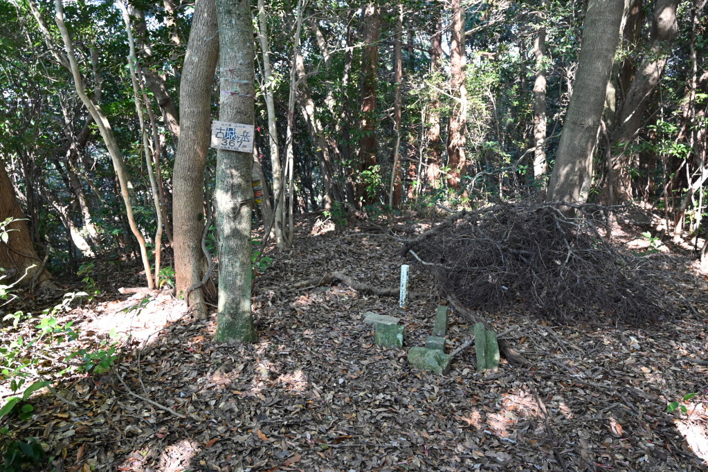 林道はすぐに良くわからなくなってしまいました。斜面を直登していく感じになってしまいましたが、伐採されて白テープが巻かれた杉の木が並んでいたのでそれを目印に上に登っていくと段郭の下端にたどり着くことができました。ここからは頭が赤いペグやピンクテープなどがあって頂上まで安心して進めました。ダムから頂上までちょうど1時間の所要でした。前日の蓮華山城に比べれば、比高は半分にも満たないし、山中で迷うこともなかったので簡単に攻城できてしまったという感じです。山頂の表示に縄張図があり、畝状竪堀が描かれていましたので、探してみましたがよくわかりませんでした。山口駅から徒歩でのアプローチでしたので時間はたっぷりとかかりましたが、午後3時の献血予約には余裕で間に合いそうです。