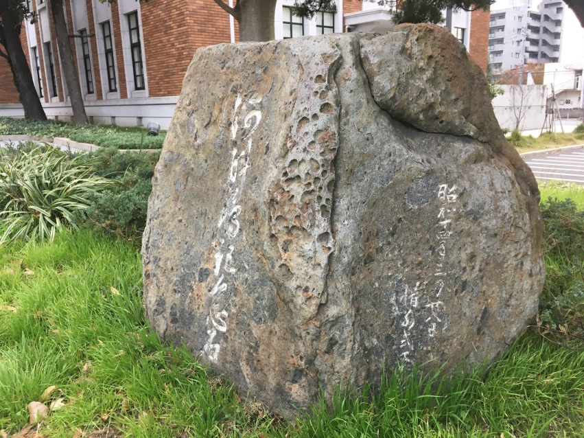 1年前は土砂降りだったので,途中下車しませんでしたが,気になっていたのが若松城でした。にのまるさんの投稿で紹介されていた「戸畑図書館前の記念石」。これを確認して,いざ若戸大橋へ向かえば感慨もひとしおだろうと…。