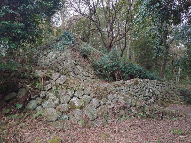 こちらの城跡は標高40m程度の場所に主郭を配置する南北120m程度、東西50m程の小規模な城館です。入ってまず立派な石垣に驚かせられます。しかしこちらの石垣は城跡裾に立つ有力庄屋が借景として築造されたものの可能性が高いらしいです。