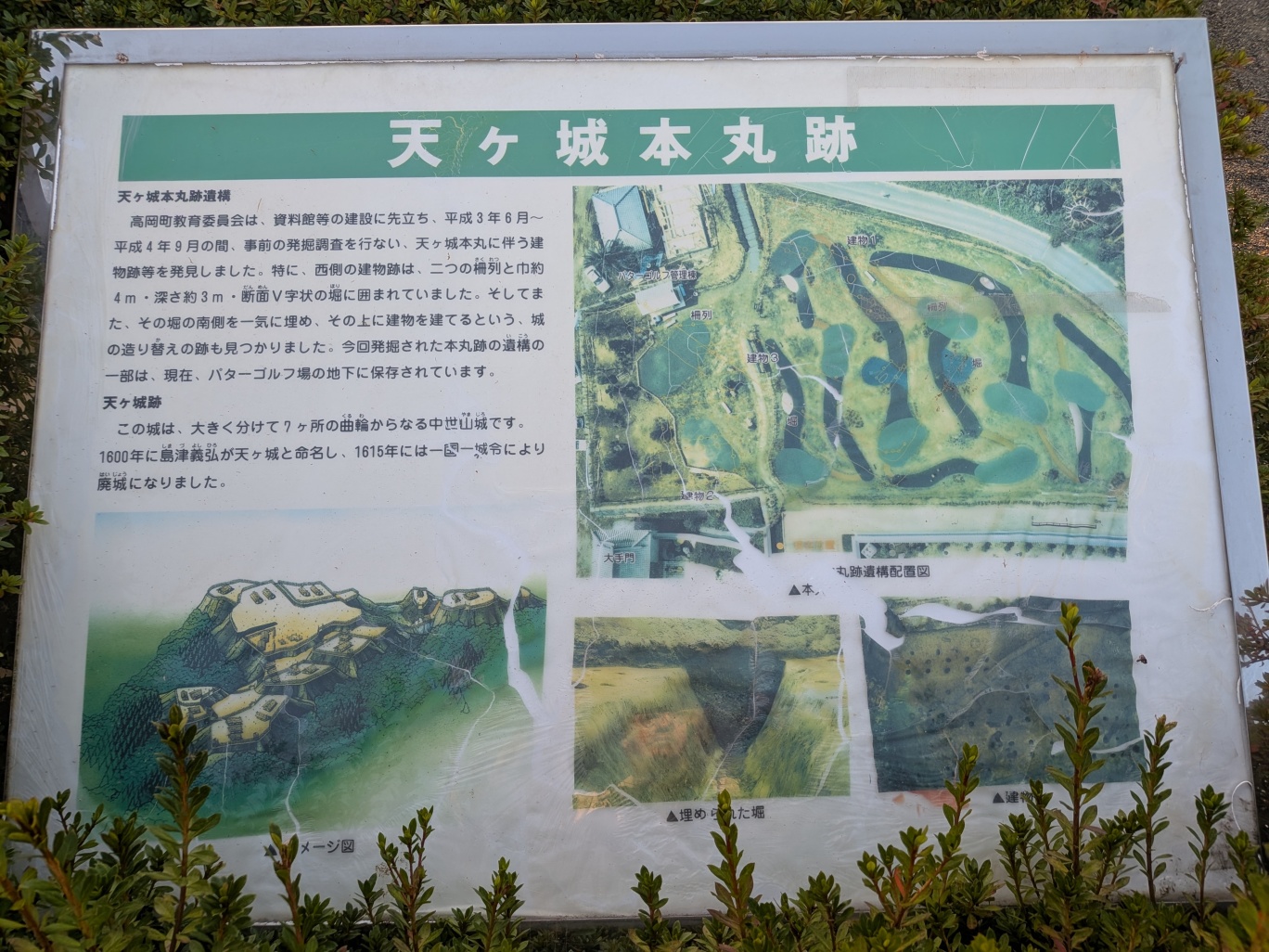 案内板に由る歴史は、慶長5年(1600年)関ヶ原撤退戦を切り抜けた島津義弘が日向帰路、伊東氏の日向回復の圧迫を受けて、鹿児島帰着後日向国境警備の重要性を固め、同年この地に城郭を築き天ヶ城と命名、島津に関連する武士団を移住させ国境警備を固めたが、元和の一国一城令で廃城、武士たちは麓に移り住んだ。