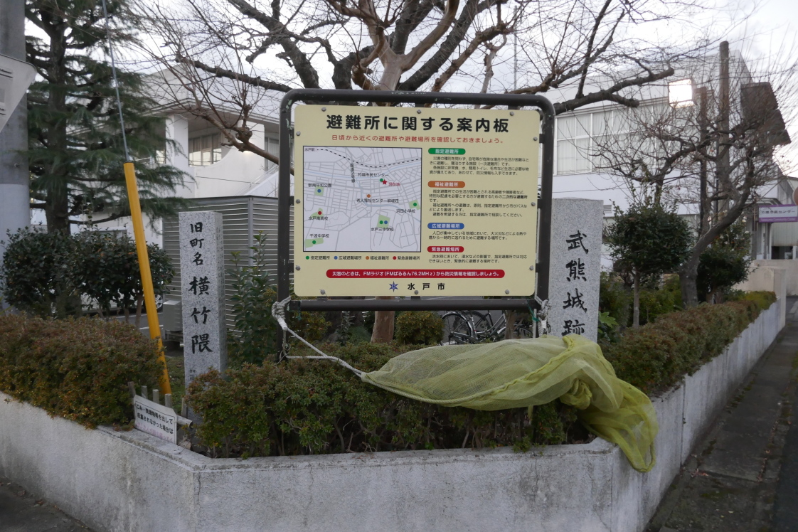 常陸吉田城を終えて水戸城方向へ移動し丁度中間に在る武熊城に初登城。水戸城からは南東に1.5km程の水戸市竹隈市民センターの東角に城名碑が側面に由来書きで立っています。
