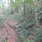 谷津からの登り坂を登り切った左手側には空堀があります。登城路の坂の部分も遠目に見ると堀のような雰囲気もあります。坂を登り切った本郭の虎口前に説明板が設置されています。