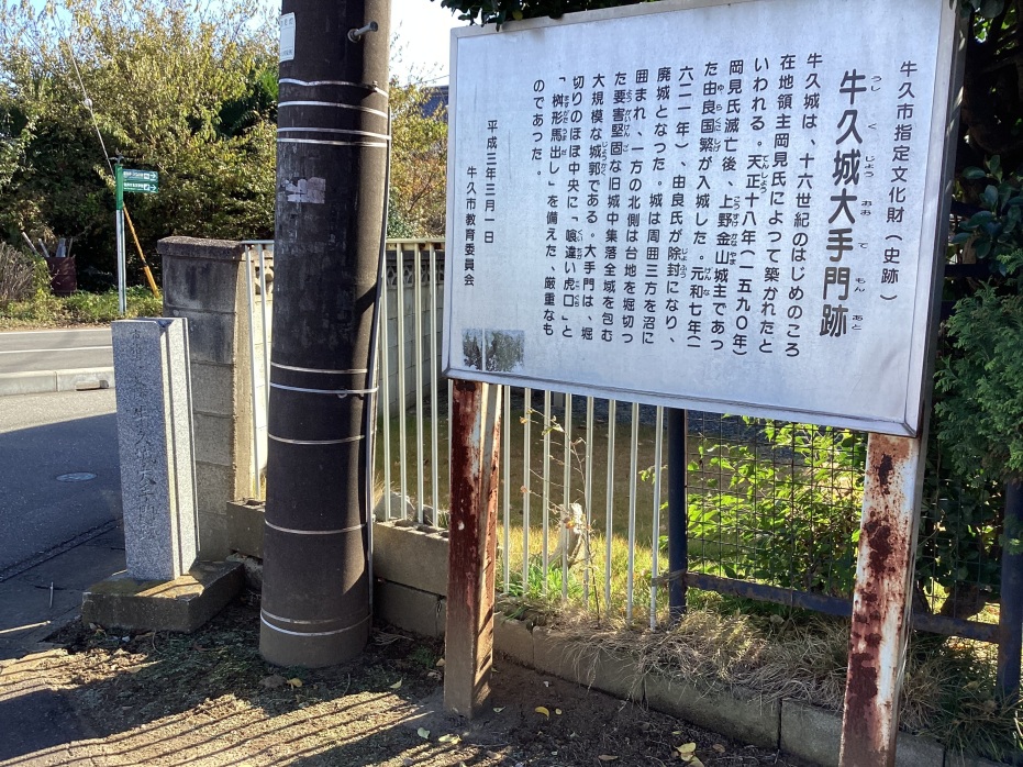 東林寺城を経由後の帰りに北にある牛久城の大手門跡も見学しました。こちらには、大手門跡の石碑と説明板があります。