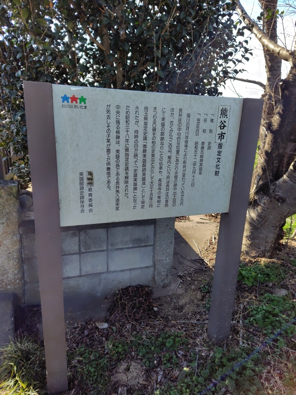 埼玉県の熊谷市に小さく「斎藤氏館実盛塚」はありました。福川沿いの土手と住宅の畑の一角にあります。