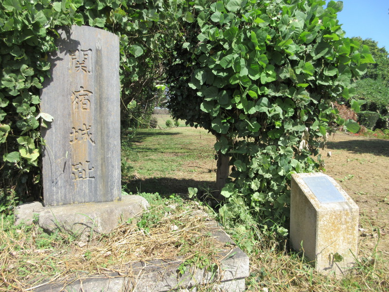 江戸町のバス停そばには、関宿関所跡の石碑があります。関所から北に進むと関宿城大手門跡の説明板があり、ここには外堀の遺構の溝が残っています。