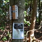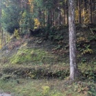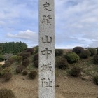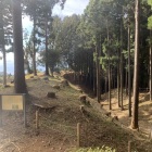 林道はすぐに良くわからなくなってしまいました。斜面を直登していく感じになってしまいましたが、伐採されて白テープが巻かれた杉の木が並んでいたのでそれを目印に上に登っていくと段郭の下端にたどり着くことができました。ここからは頭が赤いペグやピンクテープなどがあって頂上まで安心して進めました。ダムから頂上までちょうど1時間の所要でした。前日の蓮華山城に比べれば、比高は半分にも満たないし、山中で迷うこともなかったので簡単に攻城できてしまったという感じです。山頂の表示に縄張図があり、畝状竪堀が描かれていましたので、探してみましたがよくわかりませんでした。山口駅から徒歩でのアプローチでしたので時間はたっぷりとかかりましたが、午後3時の献血予約には余裕で間に合いそうです。