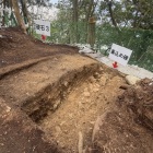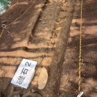 セブンイレブンさん(国道248号線弁天交差点北西角)でトイレを借りて少し買物した後車は南西角の邪魔に成らない小型車駐車エリアに駐めて、八百富神社の南参道より進行、鳥居の前に陣屋跡石垣と案内板有り、正面三段石階段の左右に2~3段の石垣が残って居る、鳥居を潜って拝殿前で参拝、東手の手水所横に坂崎陣屋跡案内板が有る、拝殿横に水が抜かれた池、陣屋跡の庭園の池か?その奥東に土塁が在る。