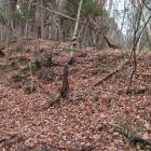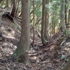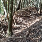 尾根にたどり着いて南に進んですぐの場所に栗原城跡がある。城址と言ってもコノ字状の土塁が付いている簡素なものだが、ここで土塁を見れるのは嬉しい。象鼻山も気になるが、まずは栗原山のピークを目指す。けっこう歩くが、道中に扁平地が多数あるので全く退屈しない。人工的なものかどうかはさておいて、これだけの数があれば多数の兵を駐屯できるだろう。