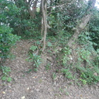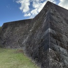 登城道を登って行くと東端の8郭にたどり着き、そこから日本海と船溜りを俯瞰できます。船溜りには人っ子一人いません・・気味が悪いな~ちょっとコワいわ。6郭の南側に土塁がわずかに残っていて、4郭あたりの隅部に石積が残っていました。