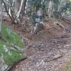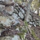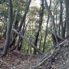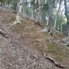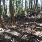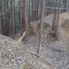 尾根の先端部は二ヵ所 二段にわたって石積で補強がしてあるようだった。先端は急峻で林業の人が足場を固めるために築いたのだろうか? だがこんな急なガケみたいな場所を通るのか? 武田方が築いたにしても、あまり武田軍が石垣を築いたというイメージは無い。
