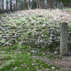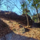 北櫓台の石垣から内側に戻り、東園跡の毛利氏時代の土塀の名残を見ながら本丸入口方面へ戻ります。