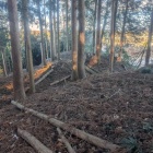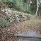 登城口は日吉神社の鳥居をくぐって左手、境内にあります。しばらく進むと防獣柵とゲートがあり開けて入ります。分岐は川を右手に登っていくと砂防ダムがあります。ここに山頂まで1200mの標識がありますので神社からだと1500mくらいあります。最初先達の鳥居をくぐって左手を日吉神社の左手と勘違いして東側にある宅地予定地のゲートから入りしばらくさまよったので大分体力を消耗しました。遊歩道の登山道はだいぶ遠回りに行くようで、途中にいつの時代か分からない石積みの窯跡群があります。