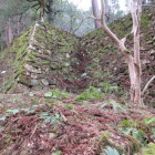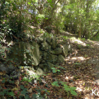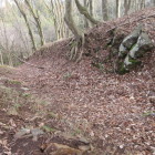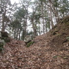 但馬富士と呼ばれる標高約201mの三開山にある城址です。主郭を中心に三方に延びる尾根に曲輪を連郭式に配置しています。曲輪周囲には多くの竪堀があり東側には二条の堀切がありました。ただ浅くなって見づらくなっているものもあります。縄張り図で畝状空堀群が描かれています。その場所を見ると雰囲気は残していますが、落ち葉の堆積もありよくわかりません。北側を少し下りた所には瑞宝寺趾、千畳敷といわれる居館跡、水の手などがあります。千畳敷周囲には石積みがあるとの情報があり、それらしき所を撮影しました。