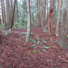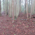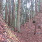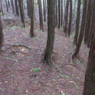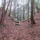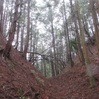 東側の尾根の堀切は比較的容易に行けました。西北にある尾根にも縄張り図では堀切が描いてあり、行こうとしましたが最初は道が見つかりません。あきらめて帰ろうとしたときに愛宕神社の北の曲輪から主郭の切岸に張り付いている細い道を見つけてしまいました。その道を通り西北の尾根に行き展開している曲輪を降りて行きました。堀切を見つけそのまま降りて行けば連郭式に配置してある曲輪を経由して下城できそうなので進んで行きました。最後の曲輪までは何とか来ましたが、そこから下りる道も踏み跡もありません。ピンクのリボンが付いている木を見つけて降りようとしましたが、踏み跡もなくかなり角度があり自分の力量では下りるのは無理と判断。比較的緩い斜面を選んで、木々を頼りに何とか下りて下城しました。