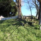 しんちゃんさんのレポートに従って、東側からアプローチ。住宅の間から白いガードレールが見え、そこに行けば五位山山頂への道がわかります。しんちゃんさんは、東側からの道を発見する前に、五位山北西から直登されているので、私は、山頂の主郭から、南西の正寿寺まで竹藪の中を直降してみました。平地を挟んで、丘の上にかつて三留屋敷があり、正寿寺になっています。正寿寺のあたりが昔からの村落のようです。家々の石垣、溝の橋など、なんでもないようなところがほぼ笏谷石で作られていて、感心しました。一乗谷や福井城には大量に笏谷石が使われていますが、1999年に採掘が終了して、現在は、既存の石の再利用(アップサイクル)が図られています。