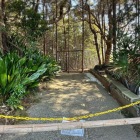 本丸の横堀は西側で40~50m崩落して居ますが、本丸の北西角下辺りから北側、東端で竪堀として落ち込んでいます。東に落ち込んでいる竪堀の上には、グレーチングの様な金属橋が架かり東端補強された遊歩道に成っている、西に樹木で鬱蒼としてますが、本丸北端切岸、土塁間に堀が続き西に堀の深さを増して北西角より南に少し落ち込み、崩落部へと続きます。