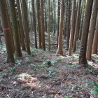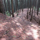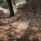 山陰ドライブ2日目はぴーかるさんに倣って尼子十砦にチャレンジです。東出雲のホテルで朝食をとってから朝一番で向かったのは、三笠山城。広瀬中央公園の野球場で少年野球の大会が開催されていたため、駐車場が埋まっていましたが、普段なら駐車場所に難渋することはないでしょう。また、登城口前の道路が工事中でしたので、付近の景観は数年で変貌を遂げるものと思われます。城郭放浪記さんの記述を頼りに出丸経由で主郭を目指しました。ぴーかるさんの投稿にある通り、二股の道の右を登ると堀切に達し、その右手が出丸のようです。ここからは尾根をひたすら登っていきますが、主郭にたどり着くのにさほどの困難はないかと思います。尾根伝いの登城路は帰りに迷う事が多々あって苦手なのですが、ここは、ピンクリボンの目印もあるので迷う心配はそれほどしなくても大丈夫かと思います。主郭付近の遺構より、出丸付近の遺構の方が見栄えが良いと思います。