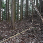 遠くからも切り立った山容が目立ちます。一方、麓のかなり高いところまで、田畑や家があるのにも驚きました。柔らかい流紋岩の上に硬い玄武岩、安山岩が載って、頂上付近は、急峻で、その下はなだらかになっているものと思います。家が途切れるところから、山頂近くまで、林道ジャバミ線が設けられています。城びと先達(しんちゃんさん、昌官忠さん)が林道ジャバミ線の悪路を指摘されています。なので、バイクで行ってみました。コンクリート舗装が終わり、土の道、ごろた石の道は、重ねて杉の枝が折り積もっており、とっても悪路でした。バイクが泥だらけになったし。車はやめた方がよいです。ジャバミ線の最後の方は、高須山頂上までのハイキングコースの一部になっており、けっこうたくさんのハイカーとすれ違いました。迷惑そうにされた..