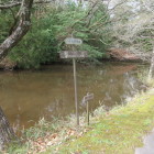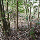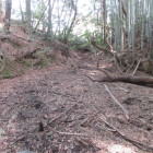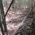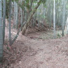 残り4城の尼子十砦、この日でのコンプリートを目指します。朝一で向かったのは、尼子十砦の亀遊山城を攻めるために毛利が築いた出雲豊岡城です。ぴーかるさんの投稿を拝見して城の西側の木橋から突入です。井川城の板の橋より遥かに怖い橋ですので、にのまるさんにはお薦めしません。足元がぬかるんでいて間違って踏み込んでしまおうものなら、靴が泥まみれになる事必定ですので早々に急斜面の竹林に入っていきました。倒竹もありましたが、さほど荒れた感じはありませんでした。空堀や堀切をいくつも確認することができましたが、光量不足で手ブレになってしまった写真が多数ありました。残念。来た道を引き返すのはかなり気が重かったので、藪漕ぎ覚悟で尾根を下っていきます。いくつもの堀切を越えて最後の写真の部分に降りてくることができました。蛇喰川を渡ってすぐの場所です。