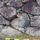 裏坂を下りていく途中にも転用石や岩盤の露頭が見られます。裏坂を下りたところには浅野期以降に台所門が設けられ、豊臣期の緑泥片岩の野面積石垣に和泉砂岩の打込接石垣を継ぎ足していることがはっきりとわかります。そして本丸北面の石垣から天守曲輪北面の石垣を眺めて歩き、浅野期に拡張された鶴ノ渓から虎伏山の南側へ。天守曲輪西面の石垣は浅野期のものなので今回はスルーして、天守曲輪南面から松ノ丸南面にかけての二段に積まれた高石垣を眺めました。平たく剥離する緑泥片岩による野面積のため高く積むのは困難ながら、二段に積むことによってかなりの高さになっています。