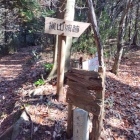 石田会館で教えてもらった経路で進みました。日吉神社に向かう石段手前を右に曲がり細い道を登りました。距離を示す道標に励まされながら40分で頂上に着きました。道中お手洗いはありませんでした。