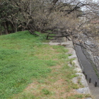 発掘発見された西の丸の南側の高石垣は、中段の遊戯施設のある曲輪の東切岸側から降りる道が有るようです、が草が少し茂りパス、下段の東屋の有る段、西石垣裾を通りモルタル護岸の裾を落ち葉と狭く慎重に降りて護岸格子状コンクリ上お歩き、目的の高石垣へ、踏み込むエリアが狭く写真を全景撮れません、草も刈られてよく観察する事が出来ました、引き返しも慎重に一歩一歩確認しながらの歩行。