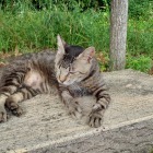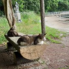 写真③の建物の屋根に狛犬が、網に包まれてました。
